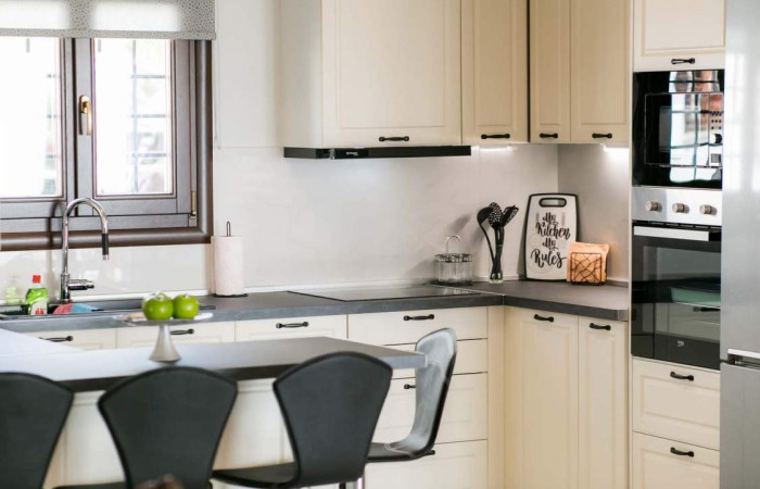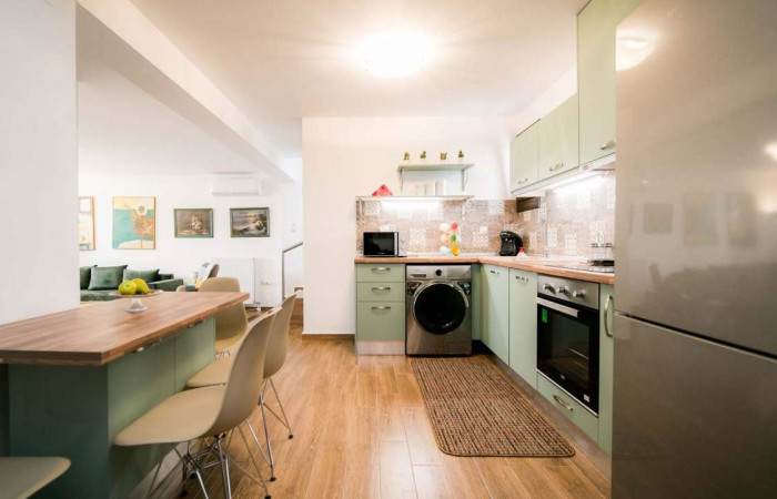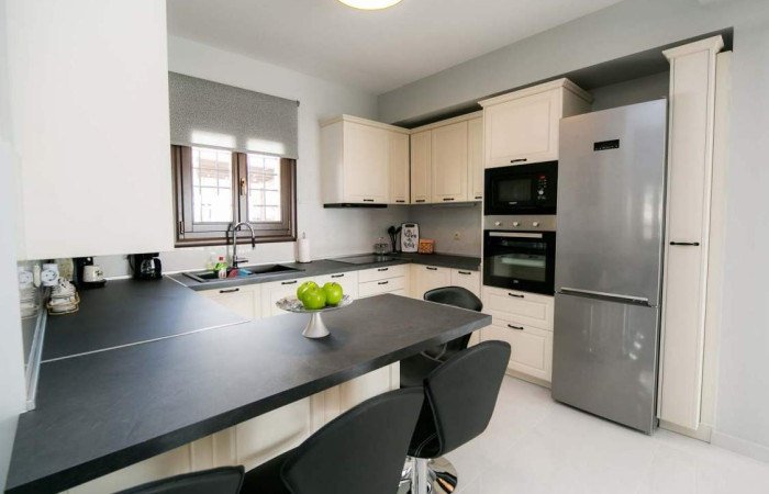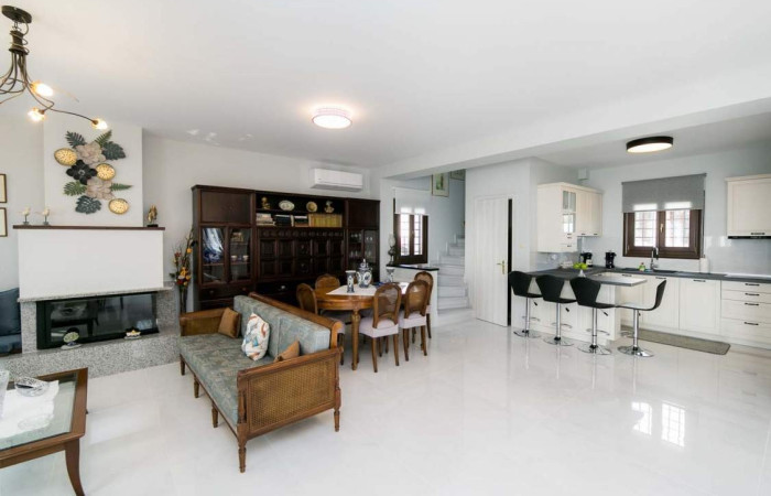 Προχωρώντας στο εσωτερικό της κατοικίας, απολαύστε την ευάερη ομορφιά του τεράστιου open plan living room, τραπεζαρίας και κουζίνας. Το ρουστίκ τραπέζι φαγητού μπορεί να φιλοξενήσει την οικογένεια και φίλους, με επιπλέον θέσεις στον πάγκο της κουζίνας. Μια ολοκληρωμένη, μοντέρνα κουζίνα διαθέτει όλα τα μαγειρικά σκεύη, εξοπλισμένα με πλυντήριο πιάτων, φούρνο μικροκυμάτων, καφετιέρα, πιάτα και μαγειρικά σκεύη. Το καθιστικό ανοίγει σε μια εκτεταμένη βεράντα όπου μπορείτε να καθίσετε και να απολαύσετε τον πρωινό σας καφέ, να δειπνήσετε ή απλά να παρακολουθήσετε τα δελφίνια να παίζουν.